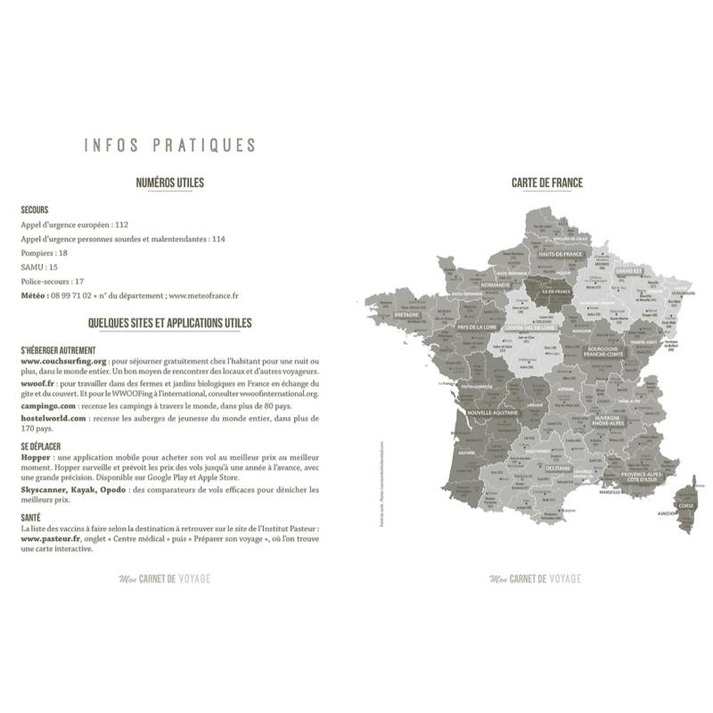 Les + produit :- Pages lignées - Infos pratiques : numéros importants, rappels de sécurité - Des pages spéciales pour noter ses bonnes adresses - Une pochette intégrée en fin de carnet pour conserver les souvenirs glanés en chemin - Un élastique pour maintenir le carnet fermé