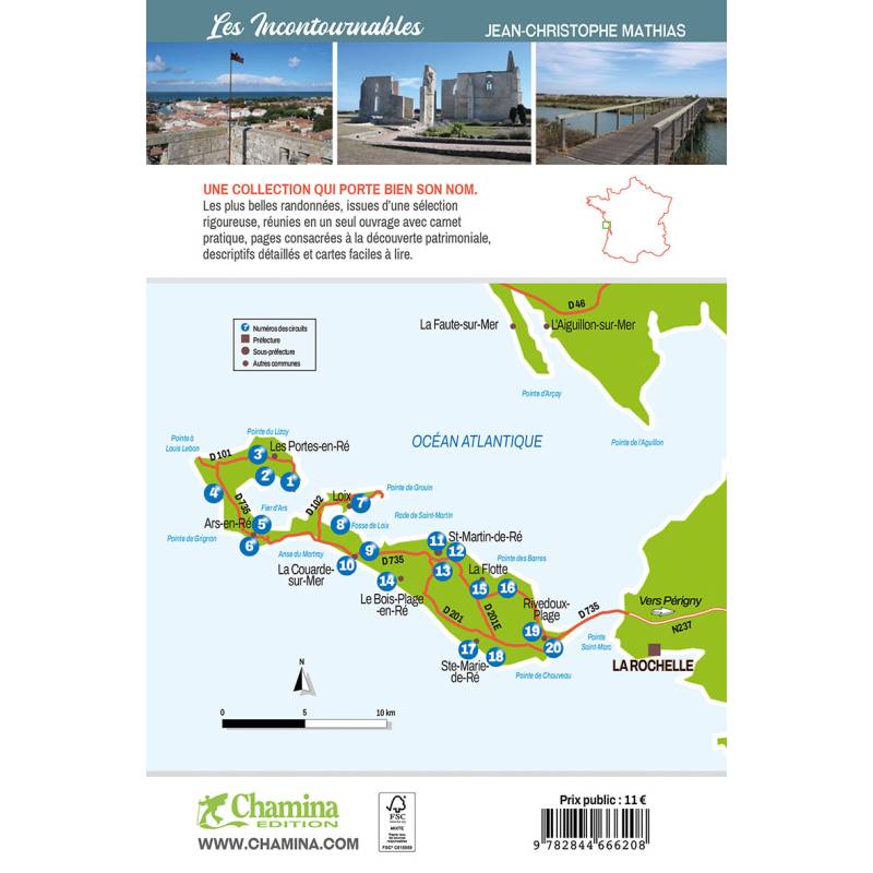 Grâce à 20 balades incontournables, Jean-Christophe Mathias nous propose de découvrir l'île de Ré sous toutes ses coutures. Le territoire concerné s'étend de la pointe de Chauveau au sud, jusqu'à la pointe du Lizay au nord, et passe également par les nombreuses communes de l'île : La Flotte, Saint-Martin-de-Ré, Le Bois-Plage-en-Ré, La Couarde-sur-Mer, Les Portes-en-Ré, etc. 4 circuits en ville permettent de les explorer.