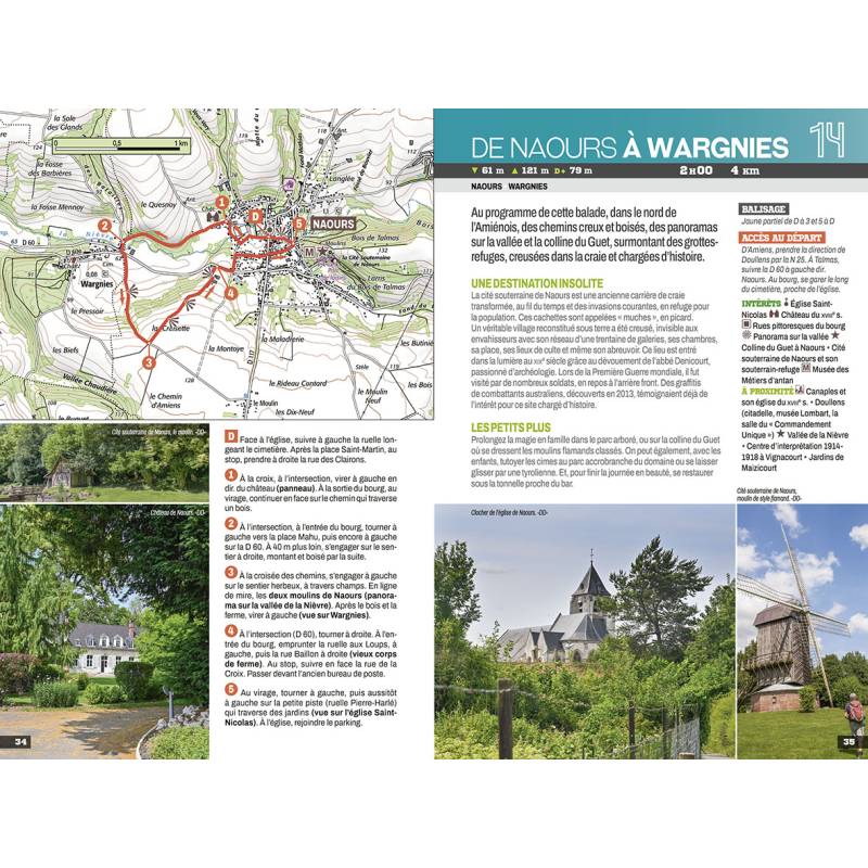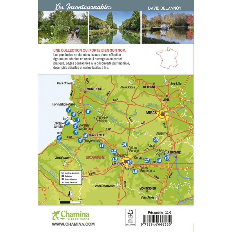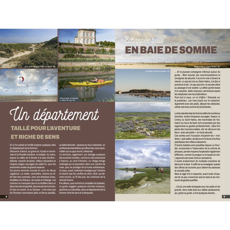 Découvrir d'abord, la Baie si renommée et la Picardie maritime, si multiple. Au menu, depuis la vallée de la Bresle à la baie d'Authie : falaises, massifs dunaires, milieux estuariens et longues plages sauvages de sable fin. On pourra remonter ensuite le cours du fleuve vagabond. La vallée réserve bien des surprises, avec ses étendues d'eau, émaillées de chenaux, de marais et d'étangs. Plus en amont, là ou la Somme paresse en doux méandres, on profitera des belvédères qui offrent des vues imprenables sur un pays secret, intériorisé. Un territoire également qui ménage quelques découvertes insolites, comme la cité souterraine à Naours, au nord d'Amiens, un village-refuge aménagé par la population dans une carrière de craie, pour se protéger de la horde soldatesque. Un pays aussi, fortement imprégné par l'Histoire et meurtri pas les conflits de 1914/1918, qui dévoile encore, au fil des pas, les cicat