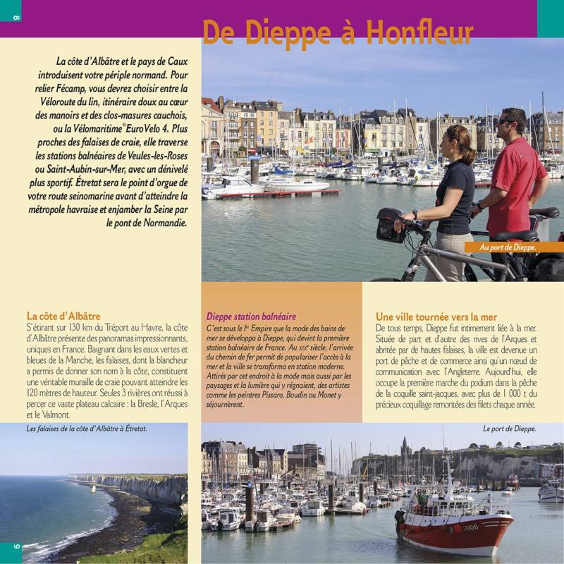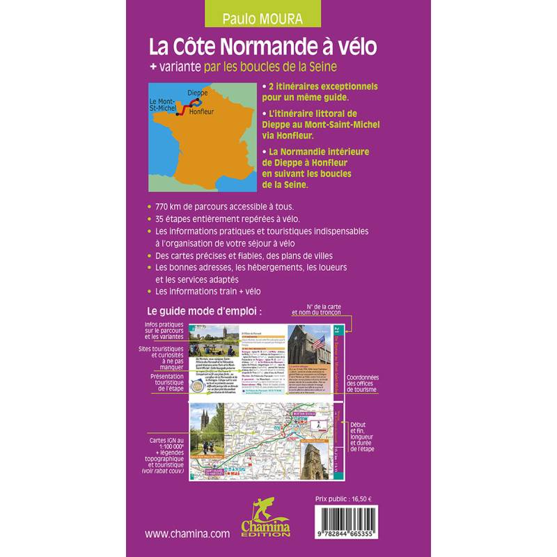 Le guide : Ce guide propose deux itinéraires exceptionnels : l'itinéraire littoral de Dieppe au Mont-Saint-Michel via Honfleur, et une variante dans la Normandie intérieure, de Dieppe à Honfleur en passant par les boucles de la Seine, pour un total de 780 km de parcours accessible à tous, le tout réparti en 35 étapes.Départements Traversés : Seine-Maritime, Eure, Calvados, Manche.Auteur(e)(s) : Paulo et Laetitia Moura sont enseignants au collège, et spécialistes aguerris du tourisme à vélo. Ils ont déjà publié de nombreux guides vélo chez Chamina édition, dont « La