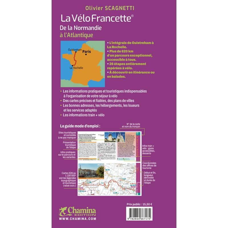 Élue « meilleure véloroute d'Europe » en 2017, la Vélo Francette est une véloroute de plus de 650 km qui relie Ouistreham à La Rochelle en traversant 3 régions (Normandie, Pays de la Loire, Nouvelle-Aquitaine). Elle assure l'interconnexion avec les autres grands itinéraires de l'ouest de la France : la Véloscénie, la Loire à vélo et la Vélodyssée®.Cette édition mise à jour contient toutes les infos pratiques pour préparer et effectuer son voyage : cartes précises sur fonds IGN au 1/100 000, plans de villes, carnet d'adresses, hébergements, loueurs et réparateurs de vélos, infos train + vélo, etc.Départements traversés : Calvados Orne Mayenne Maine-et-Loire Deux-Sèvres Charente-Maritime L'auteur :Olivier Scagnetti, diplômé de Science-Po, est un sportif accompli.