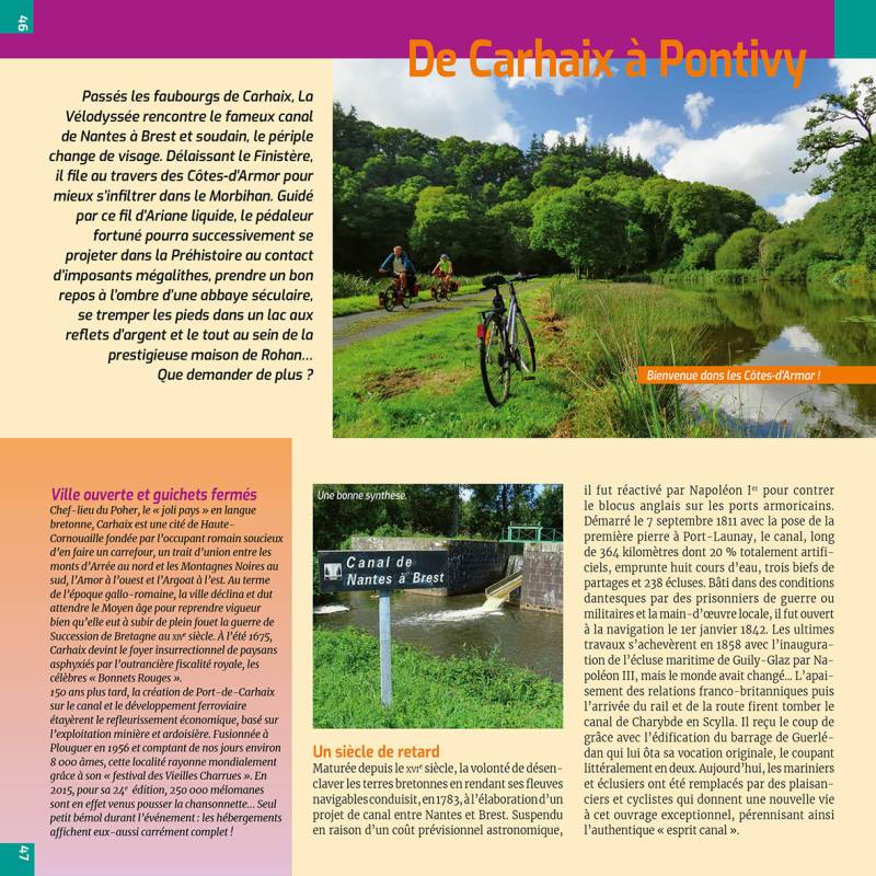 De Roscoff à Nantes, la Vélodyssée se dévoile sur 390 km de parcours facile, le long du canal et de ses 238 écluses. Une variante de 110 km de Brest à Carhaix est proposée pour plus de plaisir. Le Finistère, les Côtes-d'Armor et le Morbihan sont traversés, l'Ille-et-Vilaine est tutoyée, puis la Loire-Atlantique jusqu'à Nantes.